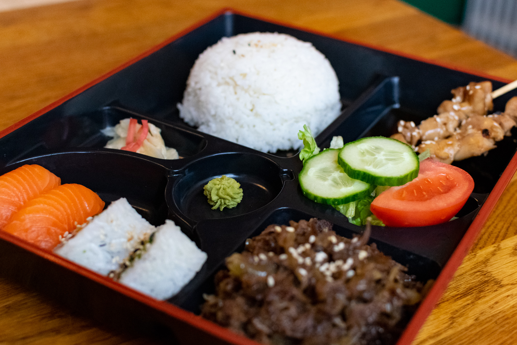 | L34 | Bento | Yakiniku, 2 grillade kycklingspett, 2 Lax, 2 Maki Roll, ris & sallad | 140Kr |